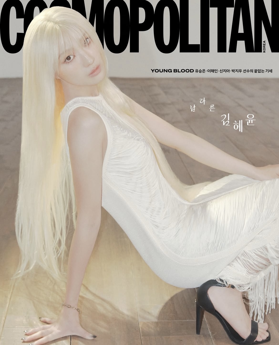 이번 화보에서 ‘금발’로 변신한 그는 과감히 스타일 변신을 시도하며 이전과는 또 다른 매력을 드러냈다. 평소 자연스럽고 청순한 이미지로 사랑받아 온 김혜윤은 이번 촬영에서 밝은 금발의 긴 생머리로 변신해 색다른 분위기를 선보였다.