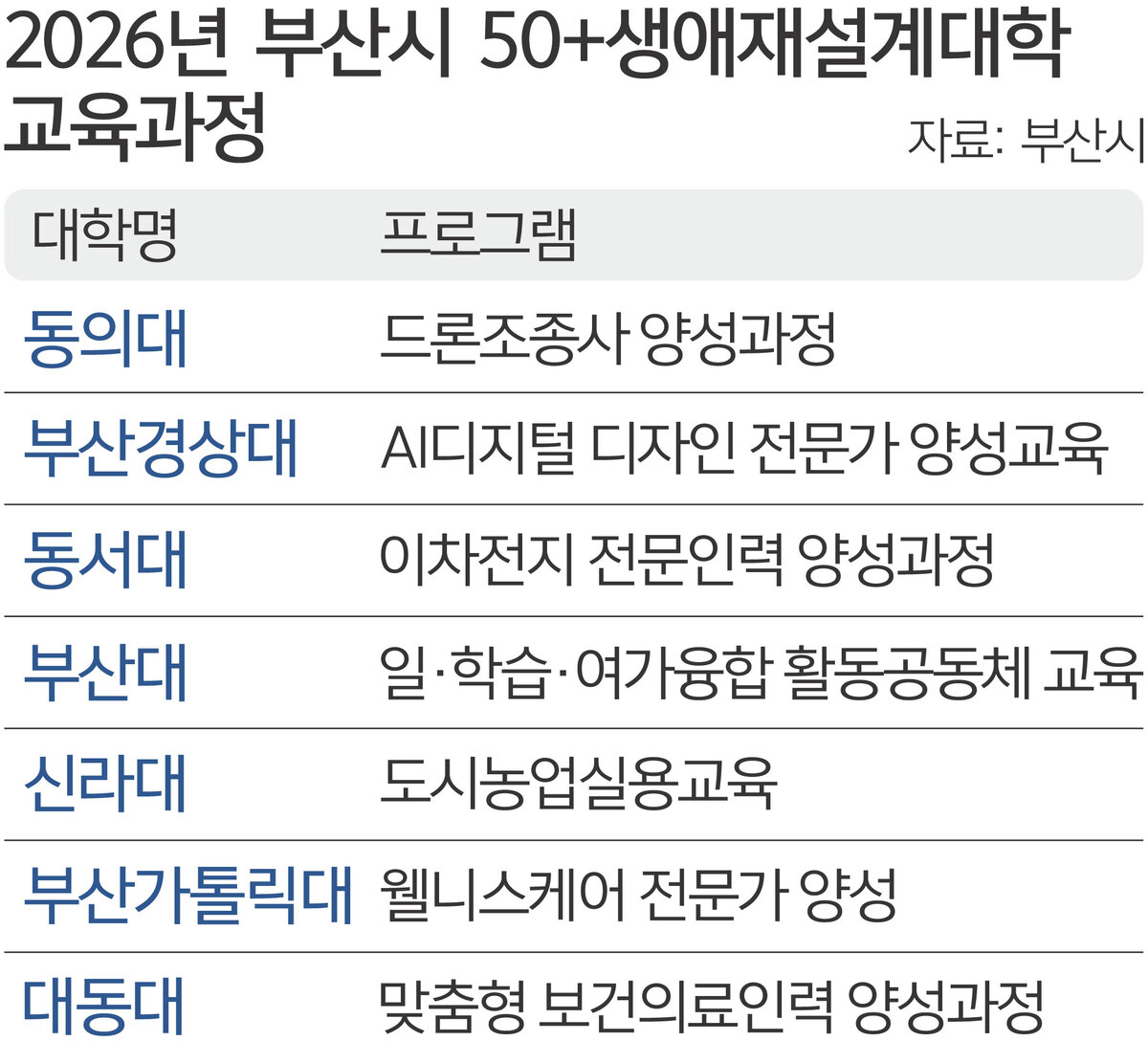 이 밖에 부산외국어대와 경남정보대, 부산과학기술대, 부산보건대는 각각 ‘예방운동관리사 양성과정’과 ‘리스타트를 위한 웰빙브런치 전문인력 양성과정’, ‘시니어패션모델전문가 과정’, ‘K푸드 건강식 조리전문가 과정’ 등을 운영한다.