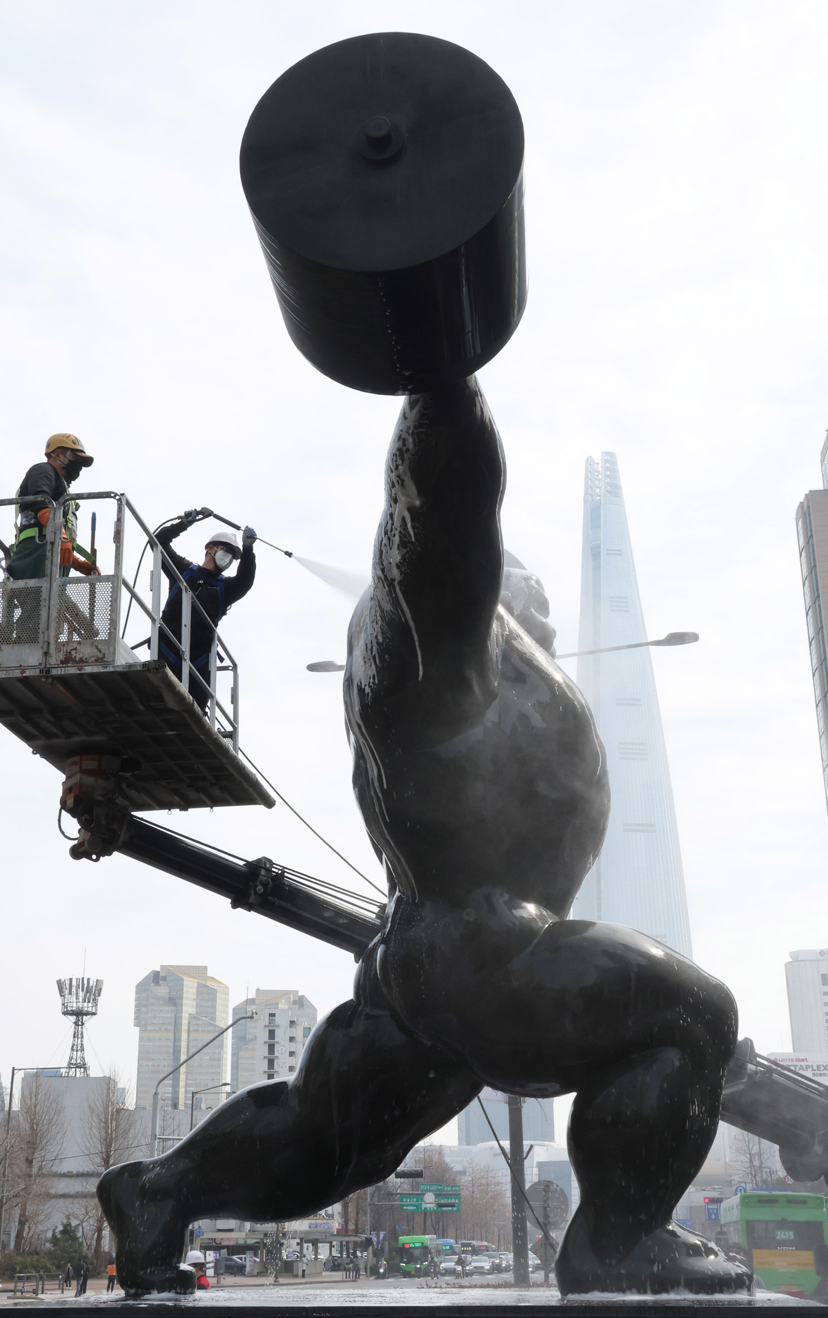 25일 서울 송파구 올림픽로에서 봄맞이 올림픽 조형물 세척 작업이 진행되고 있다. 송파구는 겨우내 쌓인 먼지와 오염물질을 제거해 깨끗하고 상쾌한 모습으로 주민들을 맞이할 예정이라고 전했다.