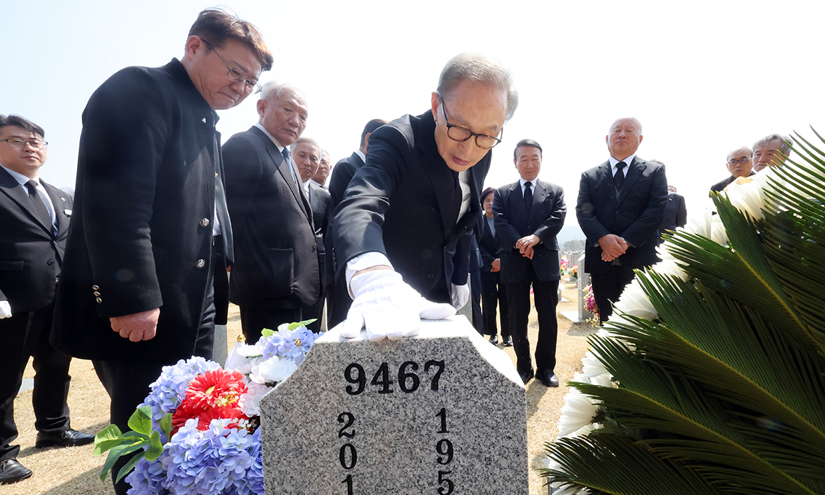 착잡한 표정으로 묘석을 바라보던 이 전 대통령은 "매번 오지만 올 때마다 참 많은 생각이 든다"며 "다들 나라를 위해 목숨을 바쳤다"고 말했다.