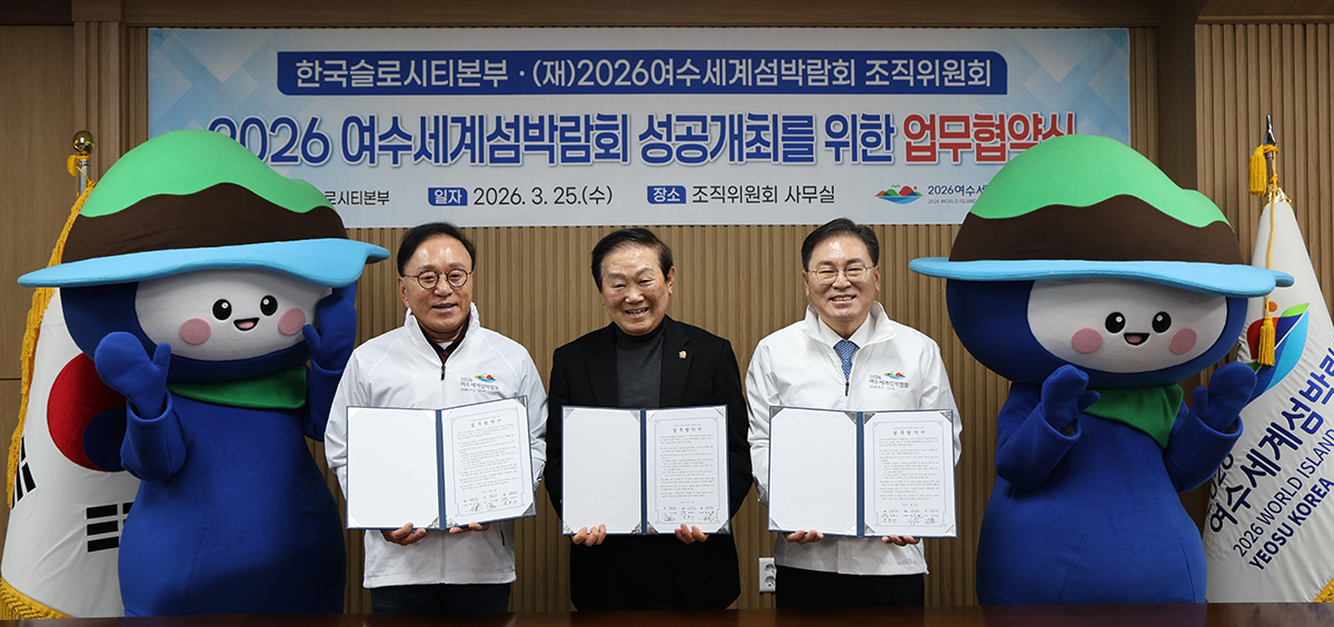 2026여수세계섬박람회 조직위원회는 25일 한국슬로시티본부와 박람회 성공 개최와 지속가능한 섬 발전을 위한 업무협약(MOU)을 체결했다고 26일 밝혔다.이번 협약은 박람회를 계기로 국제 교류를 확대하고, 국내외 슬로시티 회원 도시를 대상으로 홍보를 강화하기 위해 추진됐다. 특히 이탈리아 오르비에토에 본부를 둔 국제슬로시티연맹이 전 세계 33개국 308개 회원도시로 구성된 점에서 박람회의 글로벌 확산에 중요한 계기가 될 것으로 기대된다.