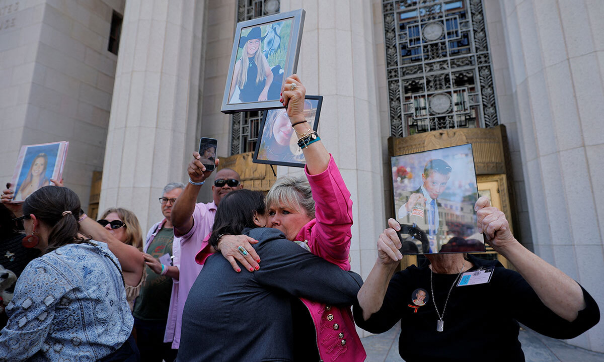 25일(현지시간) 미국 로스앤젤레스 소재 캘리포니아주 1심 법원에서 메타와 구글의 사회관계망서비스(SNS)가 청소년의 중독을 유발한다는 유죄 평결이 나오자 SNS 중독으로 18세에 숨진 애널리의 모친과 변호사가 그녀의 사진을 들고 감격의 포옹을 나누고 있다.