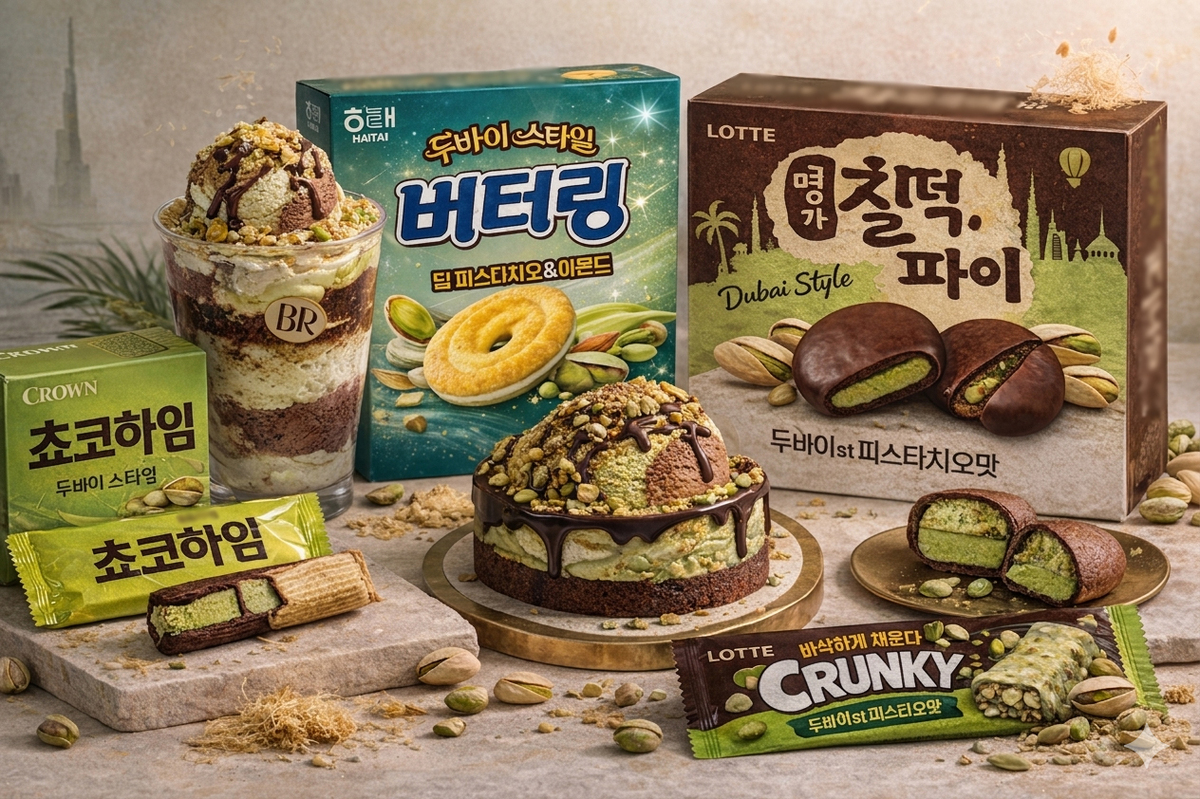 해태제과도 최근 두바이 디저트를 과자로 즐기는 두바이 스타일 시리즈를 선보였다. 제과업계에서 단일 품목으로 두바이 디저트 맛을 담은 과자가 나온 적은 있으나 5종을 시리즈로 묶어 한 번에 선보이는 것은 이번이 처음이다. 두바이 초콜릿, 두쫀쿠 등 최신 트렌드의 핵심 재료 ‘피스타치오’에 집중해 해태만의 두바이 스타일로 재해석한 스페셜 에디션이다.