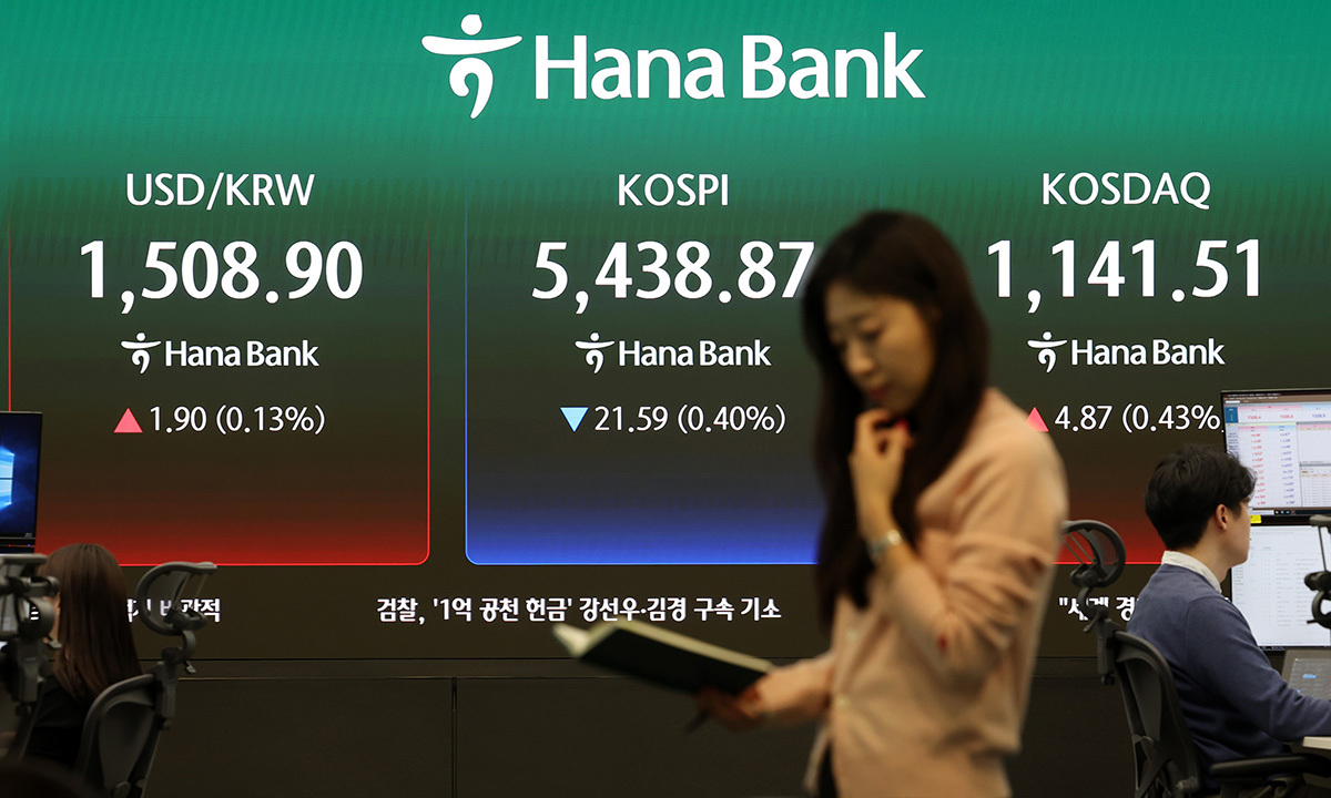 지난 27일 서울 중구 하나은행 딜링룸 전광판에 종가가 표시되어 있다. 코스닥 지수는 전 거래일(1136.64)보다 4.87포인트(0.43%) 상승 1141.51에 마쳤다. 서울 외환시장에서 원·달러 환율은 전 거래일(1507.0원)보다 1.9원 오른 1508.9원에 주간 거래를 마감했다. 뉴시스