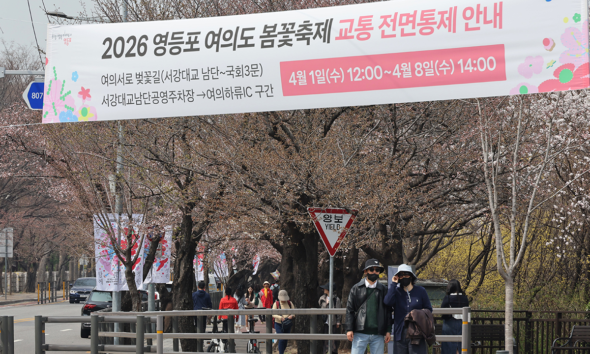 29일 서울 여의도 국회 앞 여의서로에 ‘2026 영등포 여의도 봄꽃축제’(4월 3∼7일)를 전후해 차량 통행을 금지한다는 내용의 플래카드가 걸려 있는 가운데 시민들이 꽃망울을 터뜨리기 시작한 벚나무 밑을 지나고 있다.