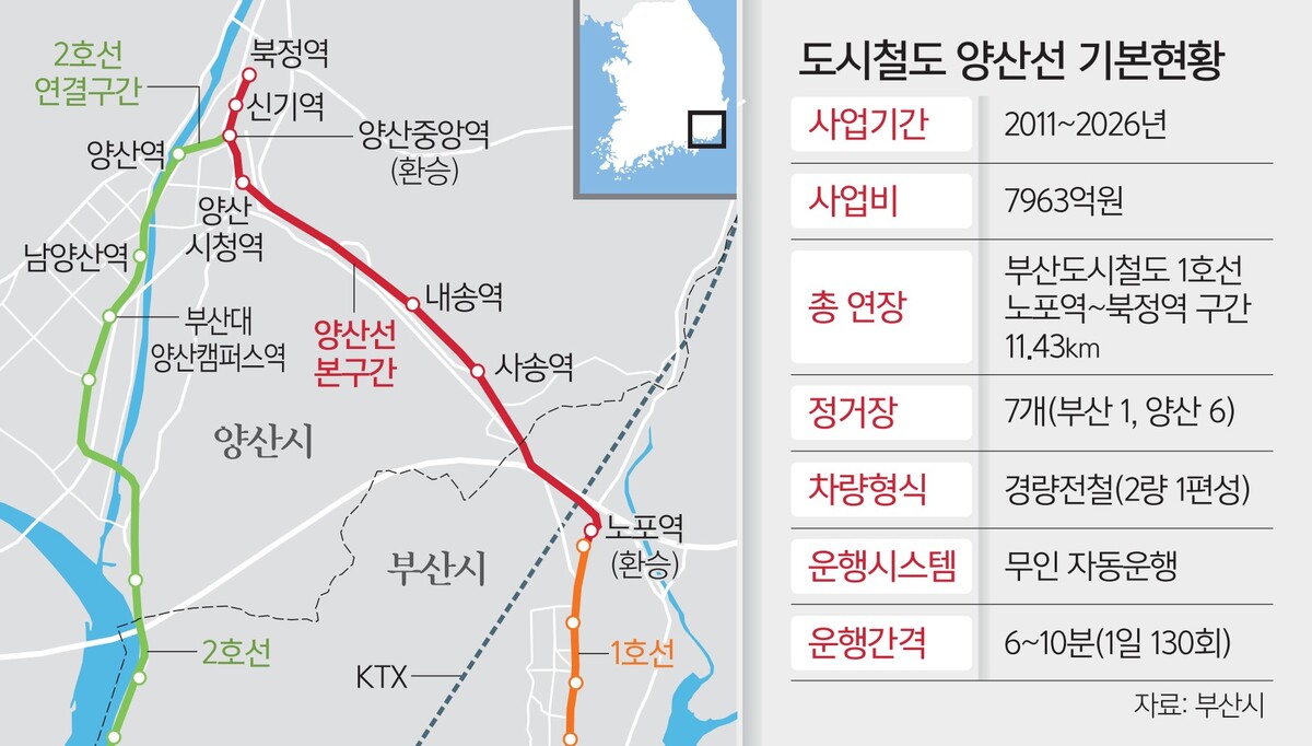 현재 96.5%의 공정률을 보이고 있는 양산선은 7963억원이 투입됐으며, 부산도시철도 노포역에서 양산 북정역까지 총 연장 11.43㎞(부산 2.1㎞, 양산 9.33㎞) 구간에 7개의 정거장이 들어선다. 양산선에 투입되는 차량은 무인으로 운행되는 경전철(2량 1편성) 형태로, 최대 140명까지 탑승할 수 있다. 전동차 운행 간격은 6∼10분으로 운행시간은 왕복 48분이며, 하루 총 130차례 운행한다.
