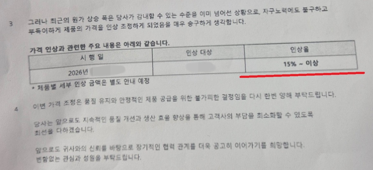 “귀사의 무궁한 발전을 기원합니다 … (중략) … 2026년 4월1일부터 단가표 기준으로 제품 가격을 조정합니다.”
