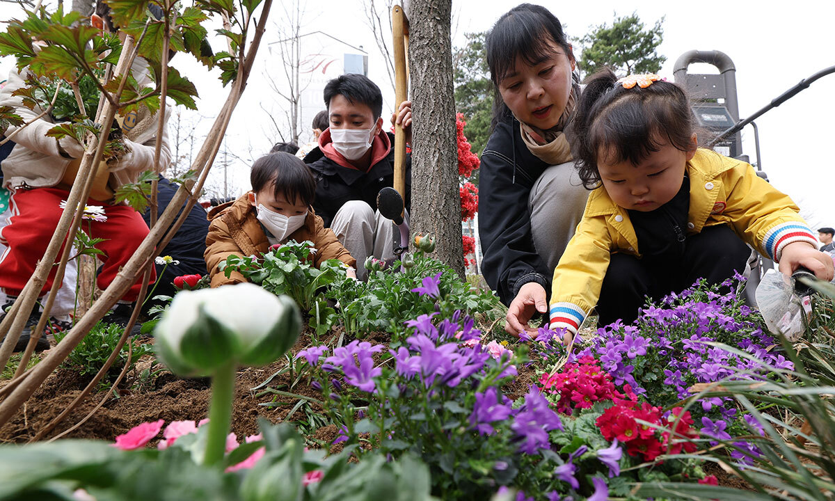 30일 서울 마포구 국화정원에서 열린 ‘제81회 식목일 기념 릴레이 정원만들기 행사’에 참가한 구민들이 화초를 심고 있다.