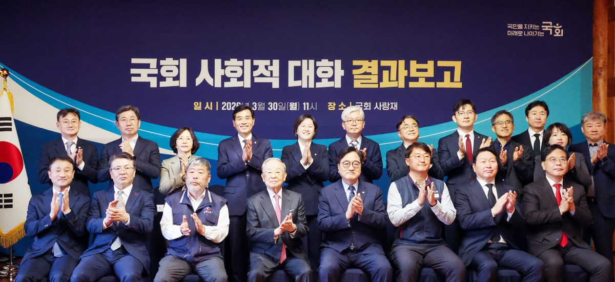 우원식 국회의장과 ‘사회적 대화’ 참여 5단체 대표자 등이 30일 국회 사랑재에서 열린 ‘국회 사회적 대화 결과보고’에서 기념 촬영을 하고 있다. 국회가 주도하는 노사정 대화 기구인 사회적 대화는 인공지능(AI) 산업 생태계 변화 및 저출산·고령화 등의 사회 전반에 걸친 복합위기를 함께 극복하자고 뜻을 모았다고 밝혔다. 앞줄 왼쪽부터 더불어민주당 한병도 원내대표, 오기웅 중소기업중앙회 부회장, 김동명 한국노총 위원장, 손경식 한국경영자총협회 회장, 우 의장, 양경수 민주노총 위원장, 최태원 대한상공회의소 회장, 국민의힘 송언석 원내대표.