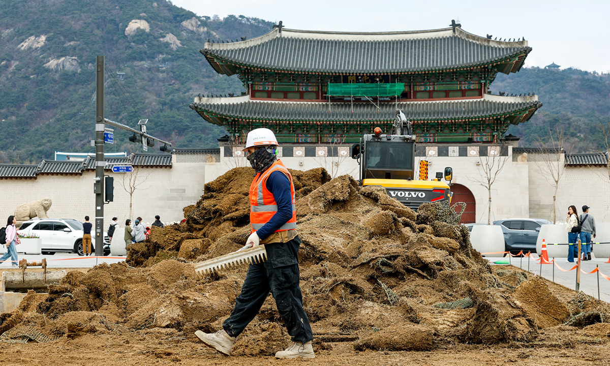 31일 서울 종로구 광화문광장에서 인부들이 방탄소년단(BTS) 컴백 라이브 공연 후 원상복구 및 봄맞이 잔디 정비 작업을 하고 있다.