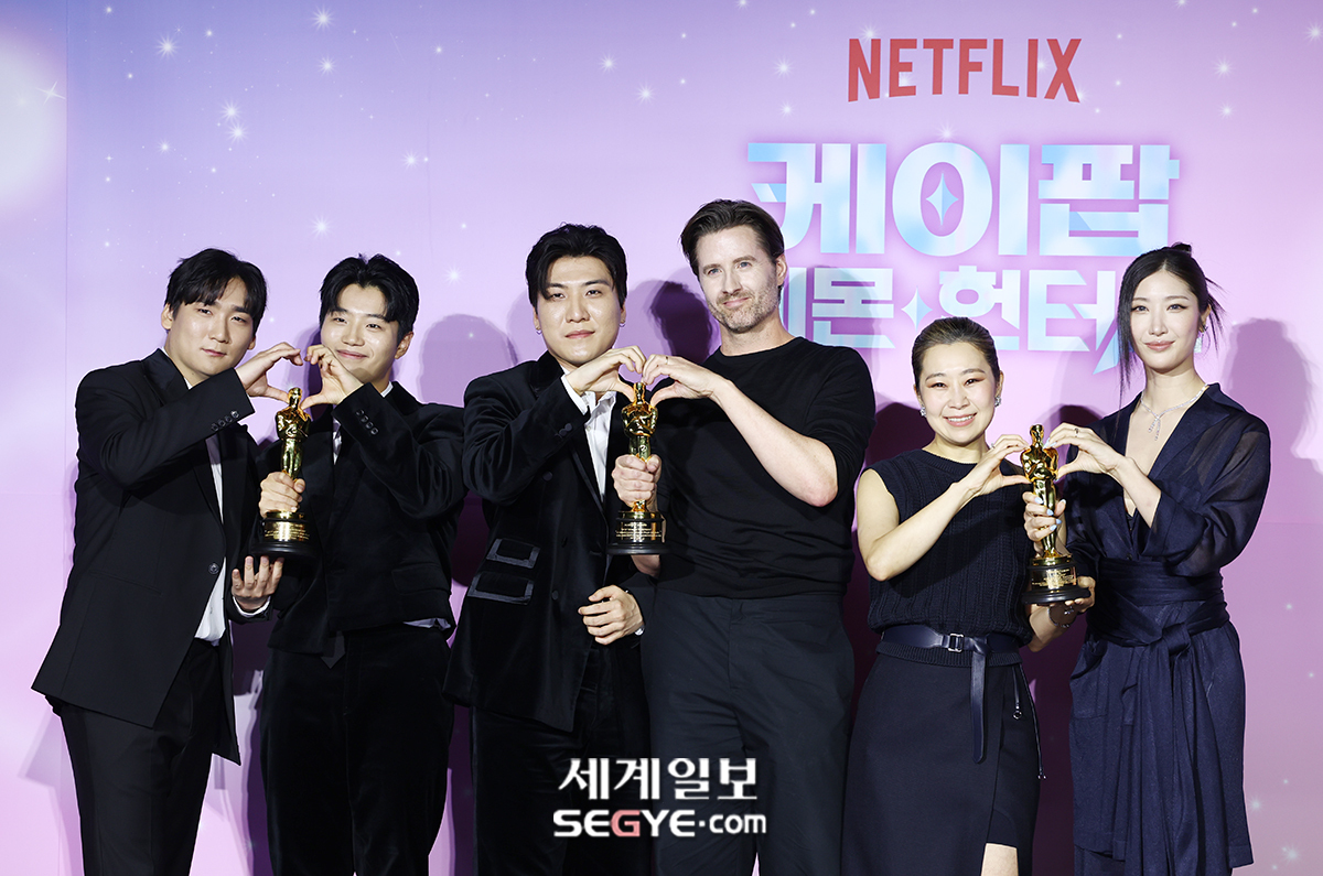 작곡가 아이디오(남희동 이유한 곽중규), 감독 크리스 애플한스, 매기 강, 가수 이재(사진 왼쪽부터)가 1일 서울 용산구 CGV용산아이파크몰에서 열린 넷플릭스(Netflix) 영화 ‘케이팝 데몬 헌터스’ 아카데미 수상 기념 기자 간담회에 참석해 포즈를 취하고 있다.