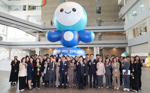 1일 서울 용산구 서울시교육청 신청사 개청식에서 정근식 서울시교육감 등이 기념 촬영을 하고 있다. 옛 수도여고 부지에 자리한 신청사는 지하 3층, 지상 6층 규모로 총사업비 1767억원이 투입됐다.