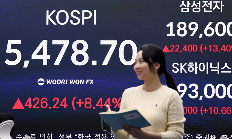 2일 한국거래소에 따르면 전날 코스피는 426.24포인트(8.44%) 뛴 5478.70에 거래를 마쳤다. 490.36포인트 오른 지난달 5일(9.63%)에 이어 역대 두 번째 상승폭을 기록했다.