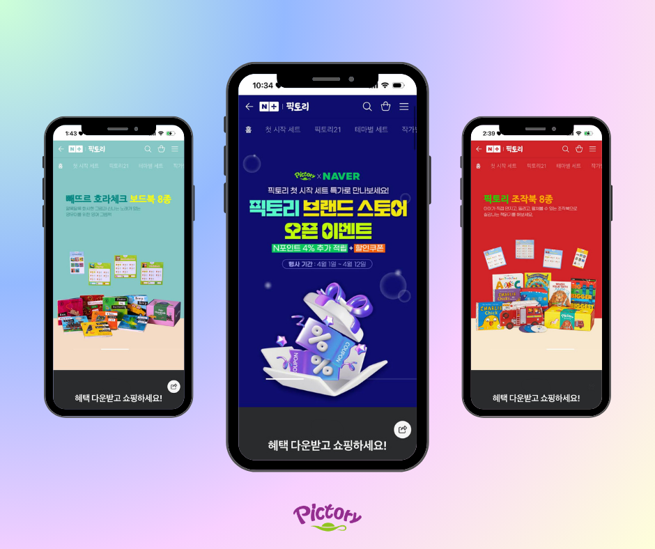 브랜드 스토어 오픈을 기념하는 프로모션도 진행된다. 픽토리의 대표 시리즈인 ▲픽토리 빼뜨르 호라체크 ▲픽토리 조작북 ▲픽토리 보드북 ▲픽토리 베어 세트에 대한 할인 행사를 진행하며, N페이 적립과 구매 금액별 할인 쿠폰을 제공하는 등 다양한 혜택을 마련했다.