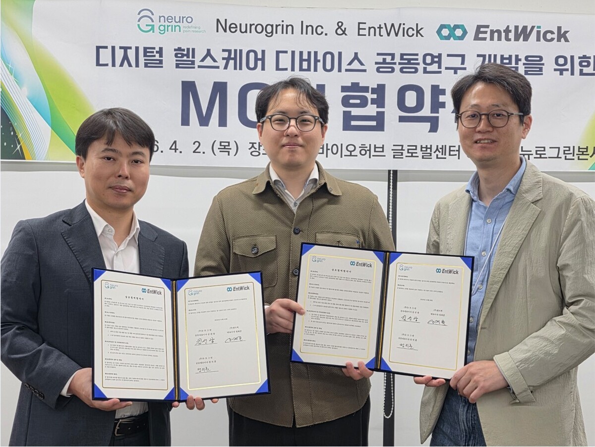 뉴로그린(Neurogrin)과 엔트윅(EntWick)은 디지털 헬스케어 디바이스 공동 연구개발을 위한 업무협약(MOU)을 체결했다고 밝혔다.