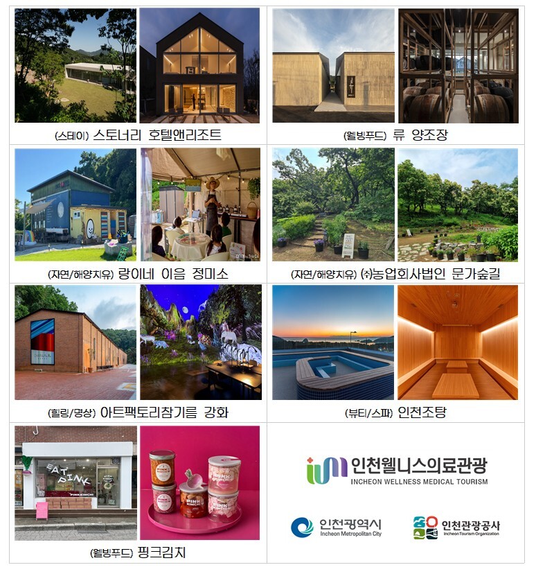 또 △웰빙푸드-마니산 천연 효모로 빚은 순수 증류주 ‘류 양조장’, 순무의 현대적 변신과 감각적 쿠킹 클래스 ‘핑크김치’ △자연·해양치유-교동도 쌀과 실향민의 서사가 깃든 미식 소풍 ‘랑이네 이음 정미소’, 밤나무숲에서 즐기는 오감 치유농업 ‘문가숲길’ △힐링·명상-숲속 산책과 미디어아트가 어우러진 ‘아트팩토리참기름 강화’ △뷰티·스파-100년 역사 해수탕 맥을 잇는 미네랄 스파 ‘인천조탕’ 등이다.