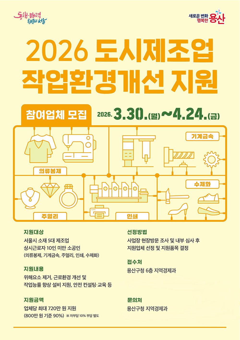 박희영 용산구청장은 “앞으로도 현장 중심의 맞춤형 지원을 통해 도시제조업 소상공인의 경쟁력을 높이고 지역 산업 기반을 더욱 강화해 나가겠다”고 말했다.