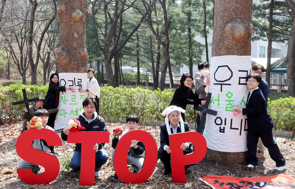 식목일인 5일 서울 종로구 경희궁에서 환경보건시민센터와 서울환경연합 관계자들이 경희궁 나무보호 캠페인 '나무야 나무야, 미안해' 퍼포먼스를 하고 있다. 행사는 경희궁에서 죽어간 140여 그루의 나무를 추모하고, 살아남은 62그루의 나무를 껴안아주는 캠페인이다.