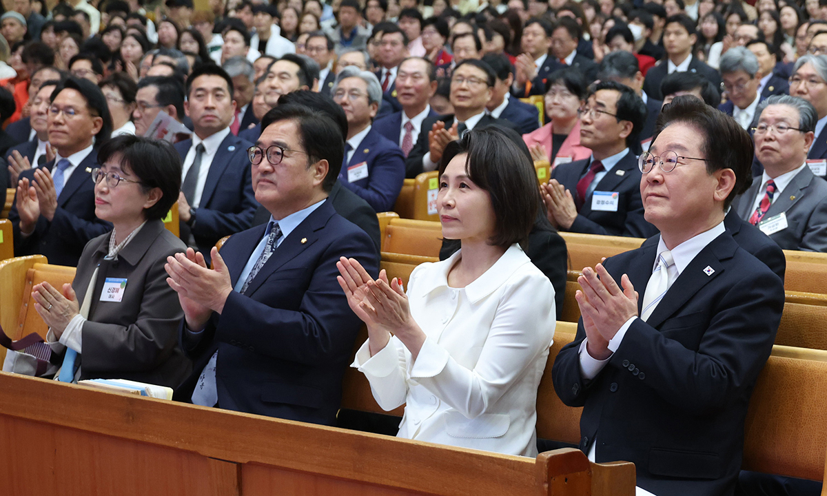 이재명 대통령과 김혜경 여사가 5일 서울 여의도순복음교회에서 열린 부활절 연합예배에 참석하고 있다. 이 대통령은 “대립과 분열이 아닌 평화, 증오와 갈등이 아닌 사랑으로 나아가는 부활의 기적이 오늘날 우리 사회에 이뤄지길 간절히 소망한다”고 밝혔다. 이 대통령(오른쪽부터), 김 여사, 우원식 국회의장, 우 의장 부인 신경혜 여사.