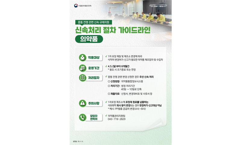 중동 전쟁으로 물품 수급에 차질이 발생하지 않도록 향후 6개월간 의약품과 의료기기 포장재 변경 등 허가 절차가 70% 이상 단축된다.