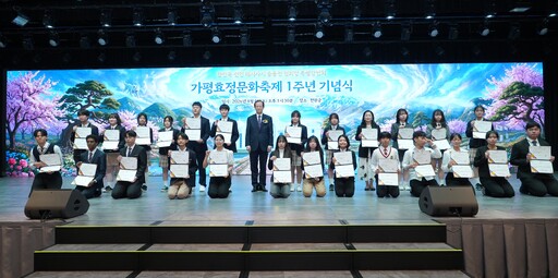 4일 오후 경기 가평군 소재 천원궁 다목적홀에서 가평 군민과 지역 사회 관계자들이 참석한 가운데 효정세계평화재단의 ‘원모평애 장학생 증서수여식’이 열렸다. 이날 행사에서는 지역 사회와 교회 공동체에서 모범이 되는 활동을 해온 초등학생 2명, 중학생 9명, 고등학생 9명, 대학생 7명 등 모두 27명의 학생이 장학생으로 선발됐다. 사진은 원모평애 장학생들이 이기성 세계평화재단 이사장(뒷줄 가운데)으로부터 장학증서를 전달받은 뒤 기념촬영하는 모습.