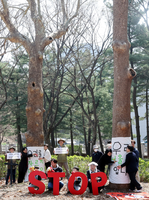 제81회 식목일인 5일 서울 종로구 경희궁 숭정문 인근에서 서울환경연합 등 시민단체 관계자들이 나무보호 캠페인 ‘나무야 나무야, 미안해’ 행사를 하고 있다. 이날 행사는 서울시가 위험목과 고사목이라는 이유로 베어낸 140여그루의 나무를 추모하고 보존 쪽으로 번복된 나머지 나무들을 위로하는 취지에서 열렸다.