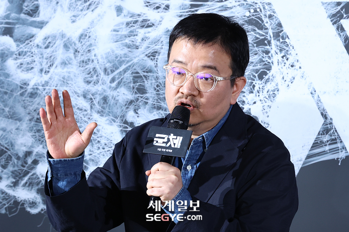 연상호 감독이 6일 오전 서울 용산 CGV에서 열린 영화 ’군체’의 제작보고회에 참석해 인사말을 하고 있다.