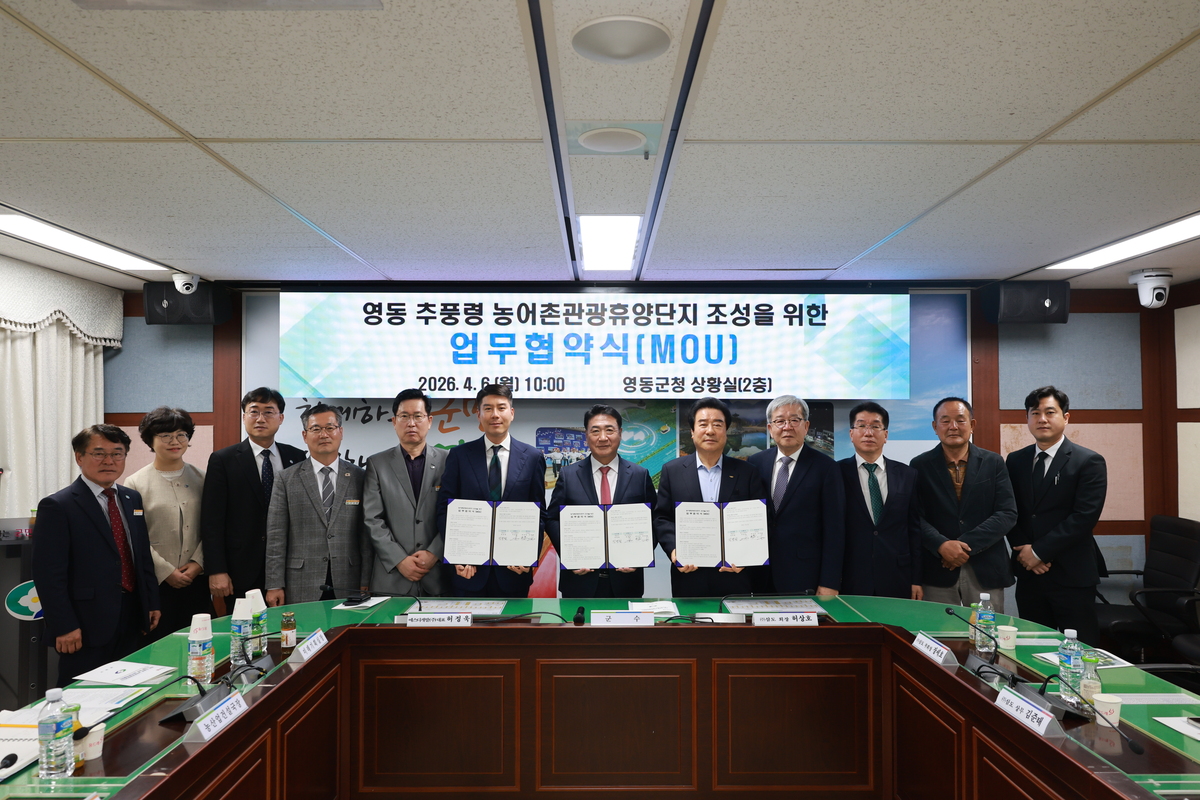 군은 시행사인 에스디개발(주), 투자사인 ㈜삼도와 ‘농어촌관광휴양단지 조성 업무협약’을 체결했다고 6일 밝혔다. 이번 사업은 영동군이 인허가 등 행정 전반을 지원하고 민간 자본 약 1800억 원이 투입되는 민자유치 사업이다.