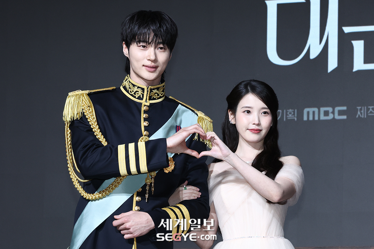 배우 변우석(사진 왼쪽)과 아이유가 6일 조선팰리스 서울 강남에서 열린 MBC 새 드라마 '21세기 대군부인' 제작발표회에 참석해 포즈를 취하고 있다.
