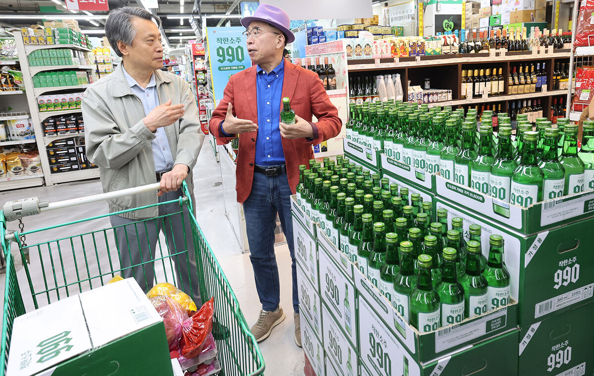 조웅래 선양소주 회장이 6일 서울 송파구 농수산물도매시장 가락몰 다농마트에서 '착한소주 990'을 소개하고 있다. 선양소주가 소상공인시장진흥공단, 한국수퍼체인유통사협동조합과 함께 출시한 '착한소주 990'은 990만 병을 전통시장과 골목상권의 동네슈퍼에서만 판매된다. 소비자 가격은 360mL 병당 990원이다.