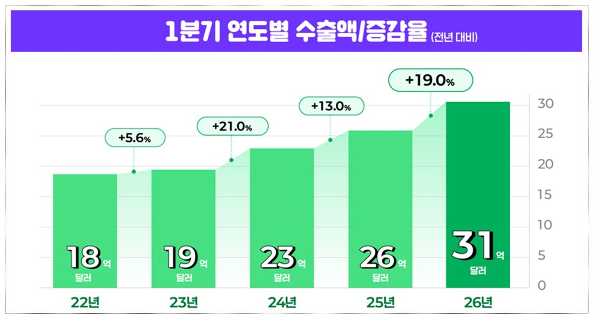 식품의약품안전처는 6일 ‘2026년 1분기 화장품 수출 통계’를 발표했다. 올해 1분기 수출액은 작년 1분기보다 19% 증가한 31억 달러로 역대 최대치를 경신했다.