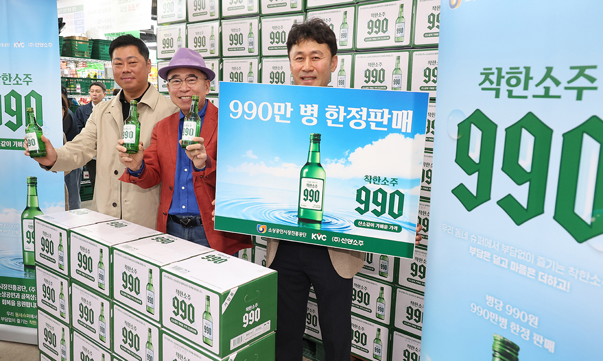 조웅래 선양소주 회장(가운데)이 6일 서울 송파구 농수산물도매시장 가락몰 다농마트에서 열린 ‘착한소주 990’ 출시 행사에서 제품을 소개하고 있다. 선양소주가 서민 부담을 덜기 위해 20년 전 수준 가격으로 출시한 이 제품은 990만병만 한정 판매된다. 소비자 가격은 360㎖ 병당 990원이다.