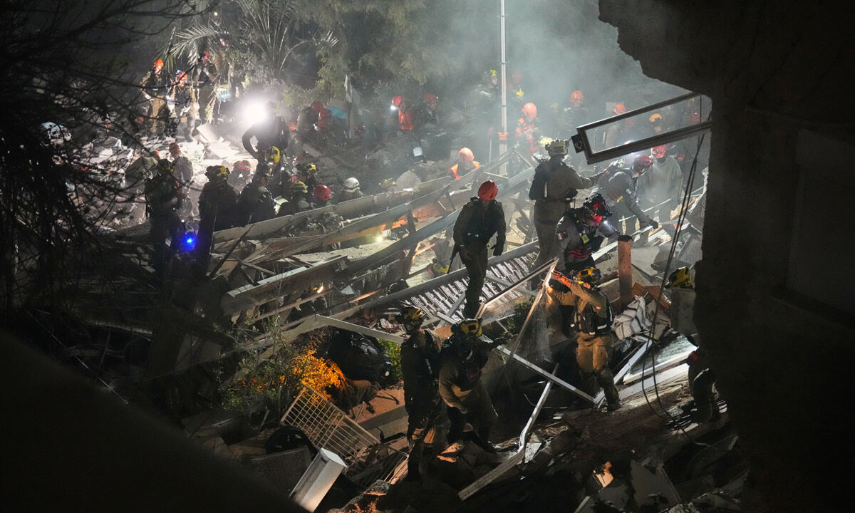 5일 이스라엘 보안군과 구조팀이 이스라엘 하이파에서 이란 미사일에 피격당한 주거용 건물 잔해를 해치며 야간 구조작업을 벌이고 있는 모습. AP연합뉴스