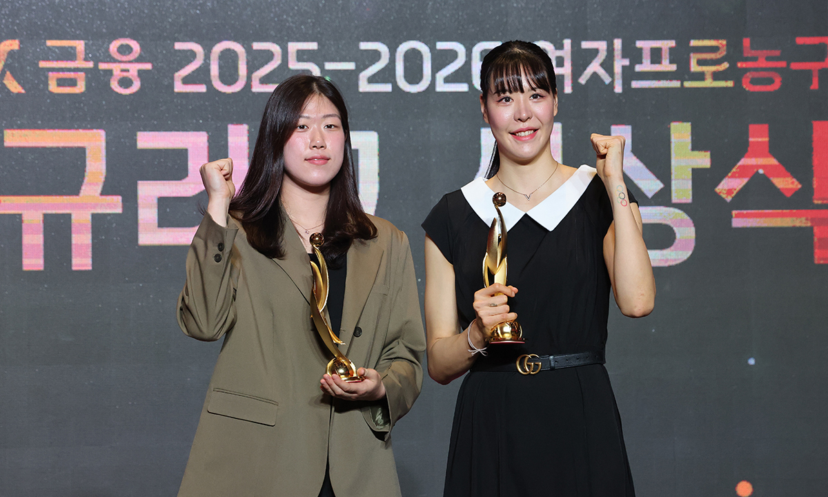2025∼2026 여자프로농구 정규리그 MVP 청주 KB 박지수(오른쪽)와 신인상 수상자 부산 BNK 김도연이 6일 서울 용산구 서울드래곤시티에서 열린 WKBL 시상식에서 기념촬영을 하고 있다. 연합뉴스