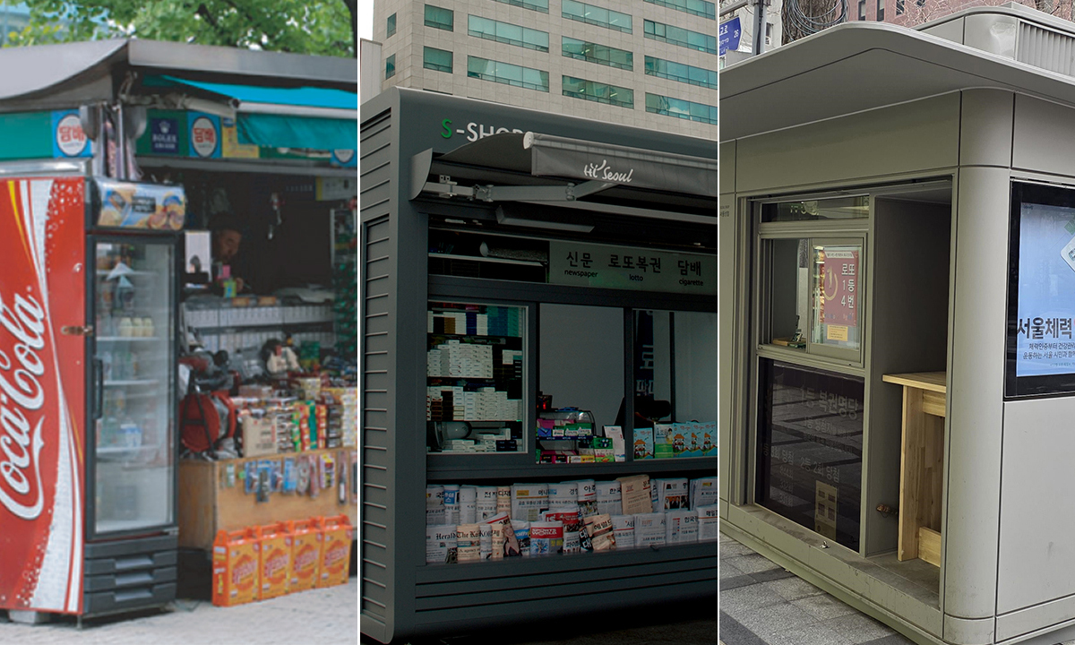 2008년 이전 가로판매대.(왼쪽부터), 2009년 이후 디자인서울 1.0 적용 가로판매대. 2024년 이후 디자인서울 2.0 적용 가로판매대. 서울시 제공