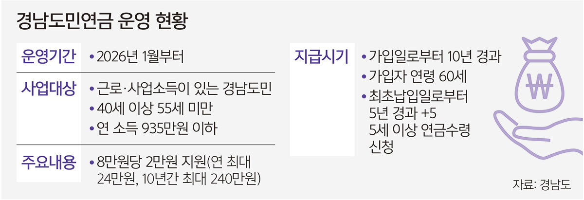 경남도는 도민연금 가입자를 추가 모집하고 있다. 당초 도는 매년 1만명씩 10년간 10만명을 모집할 계획이었지만, 올해 3만명, 내년 2만명으로 모집 인원을 늘렸다. 이후 8년간은 매년 1만명씩 10년간 13만명을 모집할 예정이다. 경남도는 가입대상을 40세 이상 55세 미만에서 청년으로 확대하는 방안도 검토하고 있다. 박완수 경남지사는 “금융시장 상황 변화 등에도 안정적인 수입 보장이 이뤄지도록 기금을 운용하고, 제도도 지속적으로 개선하겠다”고 밝혔다.