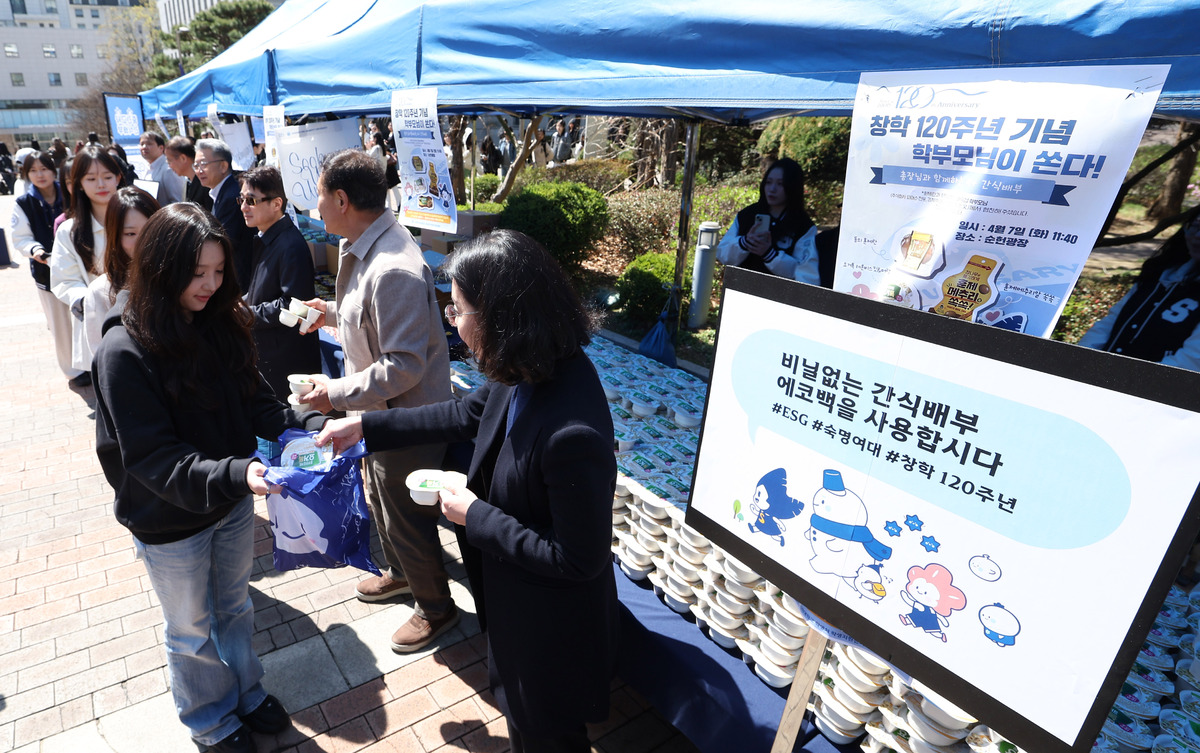 중동 전쟁 여파로 포장재 수급 불안이 계속되고 있는 가운데 7일 서울 용산구 숙명여자대학교 순헌관 광장에서 '창학 120주년을 기념 중간고사 간식 배부 행사'가 진행했다. 이번 행사는 1학기 중간고사를 앞둔 학생들을 격려하기 위해 마련됐다. 총 1200명의 학생들에게 간식이 제공됐다.