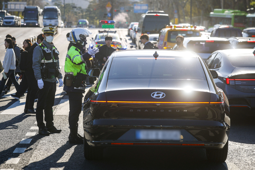 서울경찰청이 끼어들기·꼬리물기 위반에 대한 대대적인 단속에 나선 7일 경찰이 서대문구 연세대 교차로에서 차량 한 대를 세우고 단속과 계도를 진행하고 있다. 승용차 기준 꼬리물기는 범칙금 4만원, 끼어들기는 범칙금 3만원과 벌점 10점이 부과된다.