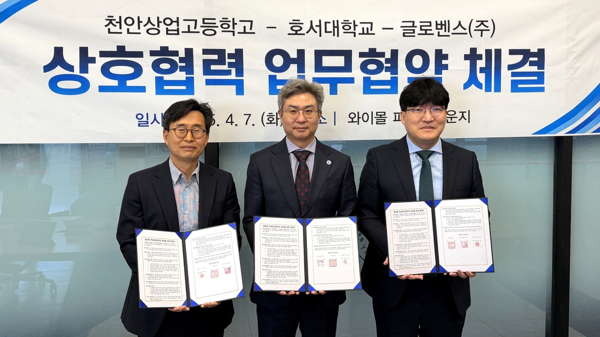 호서대는 교내 비즈니스라운지에서 천안상고, 글로벤스(주)와 ‘협약형 특성화고등학교 육성사업 추진을 위한 업무협약’을 체결했다고 7일 밝혔다.