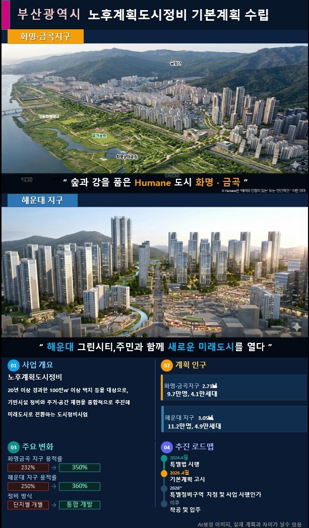 부산시가 국토교통부로부터 노후계획도시정비 기본계획 1단계 사업(화명·금곡, 해운대)을 승인받고, 비수도권 최초로 고시를 통해 부산형 미래도시 전환을 위한 본격적인 첫걸음을 내디뎠다.