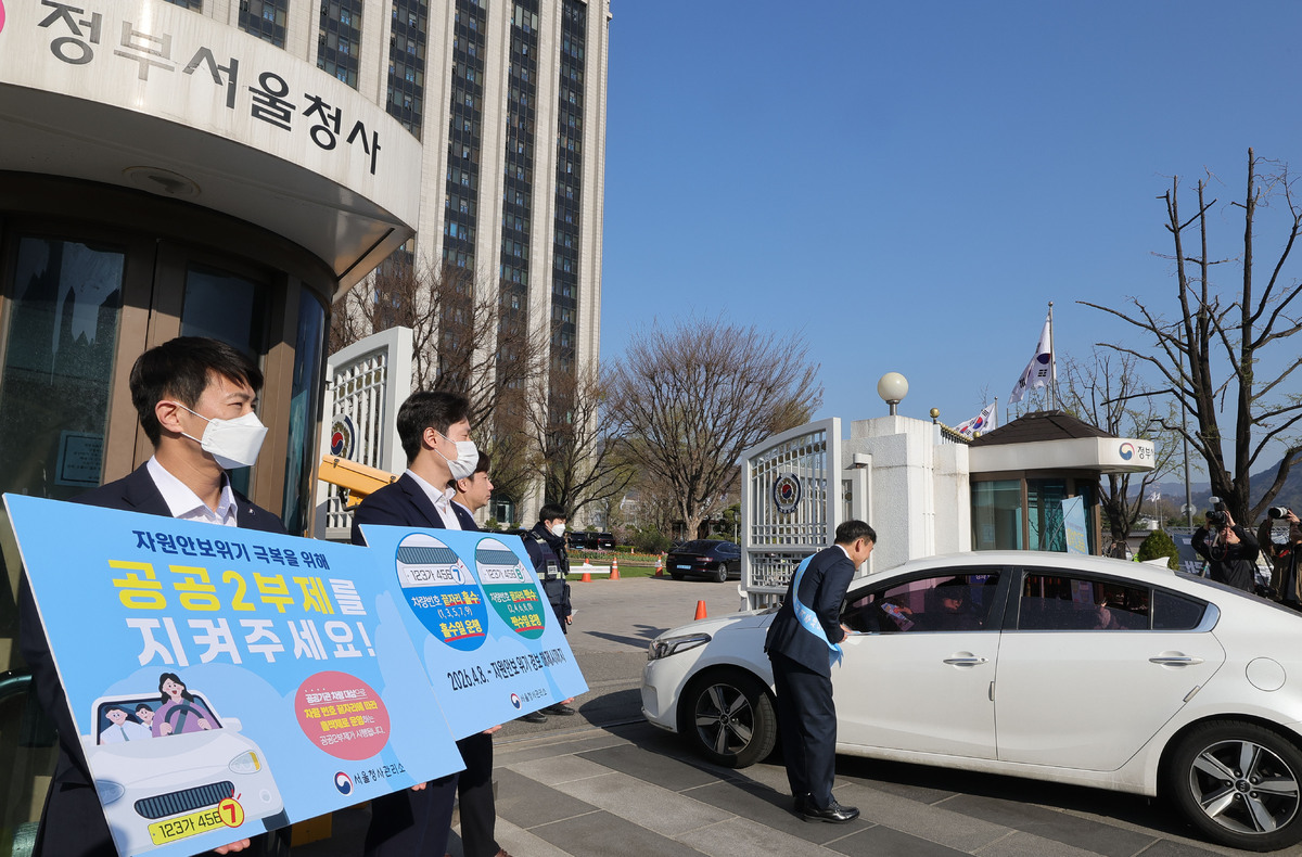 8일 서울 종로구 정부서울청사 앞에서 청사 직원들이 자원 안보 위기 경보가 3단계인 '경계' 단계로 격상됨에 따른 공공기관 차량 2부제 캠페인을 벌이고 있다. 오늘부터 공공기관에는 자동차 2부제(홀짝제), 공공기관이 운영하는 공영주차장에는 5부제(요일제)가 시행된다.