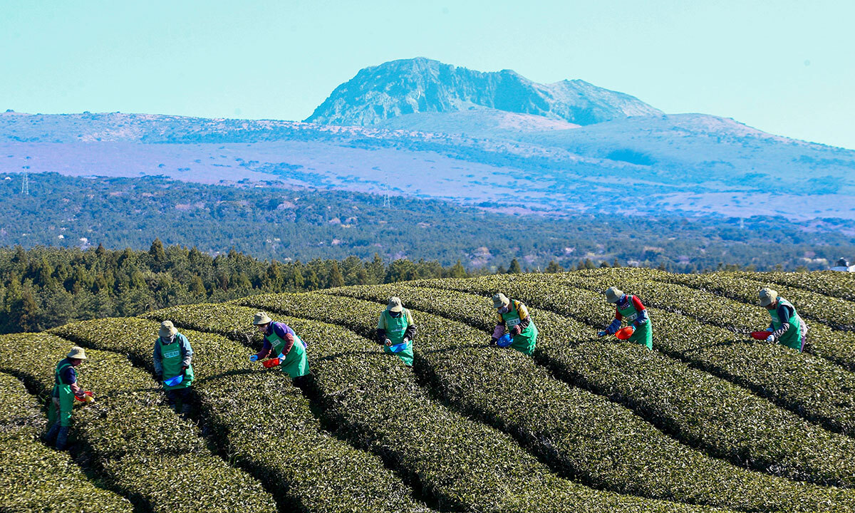 8일 제주 서귀포시 오설록농장 차밭에서 주민들이 한라산을 등지고 유기농으로 재배한 녹차 새순을 처음 수확하고 있다.