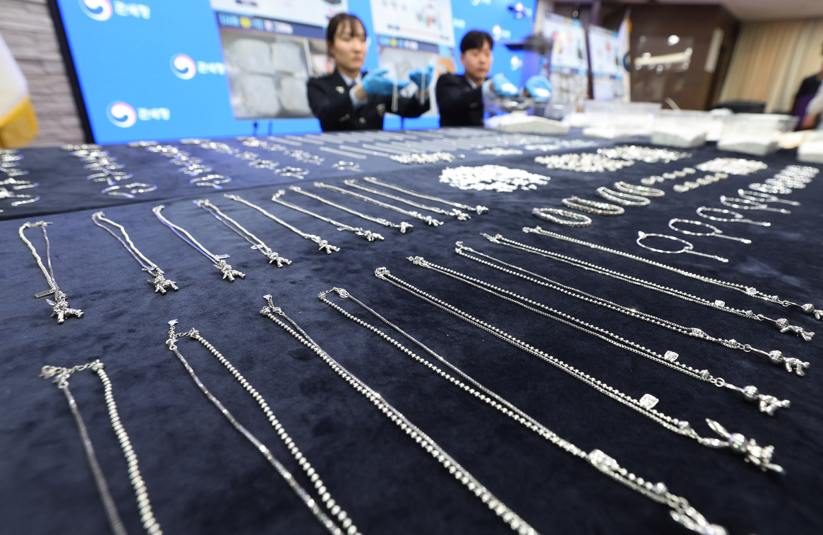 8일 인천 중구 인천공항세관 수출입통관청사 대회의실에서 관세청 관계자가 적발된 은 밀수품을 공개하고 있다. 관세청은 지난 3월 인천공항에서 은 그래뉼(입자 형태)을 5kg 단위로 소포장해 여행용 가방 등에 은닉한 후 인천공항에 1회 입국 시 20kg씩 밀수하는 수법으로 30회에 걸쳐 총 567kg(시가 34억 원)을 국내로 밀수한 일당 9명을 검거했다. 1~3월 은 밀수 적발은 14건 45억6100만원에 이르며, 작년 전체 적발액의 2.7배다.
