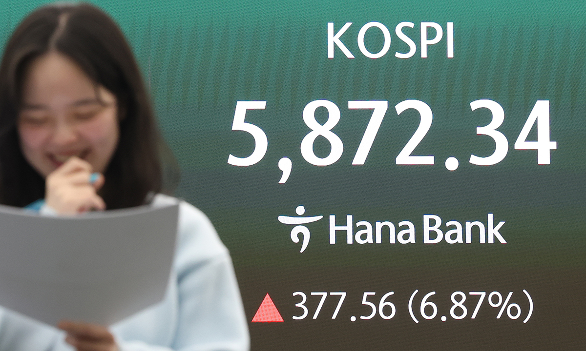 한국거래소에 따르면 이날 코스피는 전장보다 377.56포인트(6.87%) 오른 5872.34에 거래를 마쳤다. 지수는 309.92포인트(5.64%) 오른 5804.70으로 출발해 단숨에 5800선을 돌파한 뒤 안정적인 상승 흐름을 장 마감까지 유지했다. 외국인과 기관이 각각 2조4722억원, 2조7145억원을 순매수하며 지수를 끌어올렸다. 반면 그동안 하락장에서 외국인, 기관의 매물을 받아냈던 개인은 대거 차익 실현에 나섰다. 5조4165억원을 팔아치우며 역대 최대 순매도 규모를 기록했다