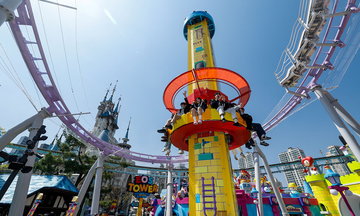 8일 서울 송파구 롯데월드 어드벤처 야외공간에 마련된 ‘메이플 아일랜드 존’에서 나들이객들이 드롭형 어트랙션 ‘에오스 타워’를 즐기고 있다. 메이플 아일랜드 존은 롯데월드 어드벤처가 넥슨과 손잡고 조성한 2000㎡ 규모의 스토리형 테마파크다.