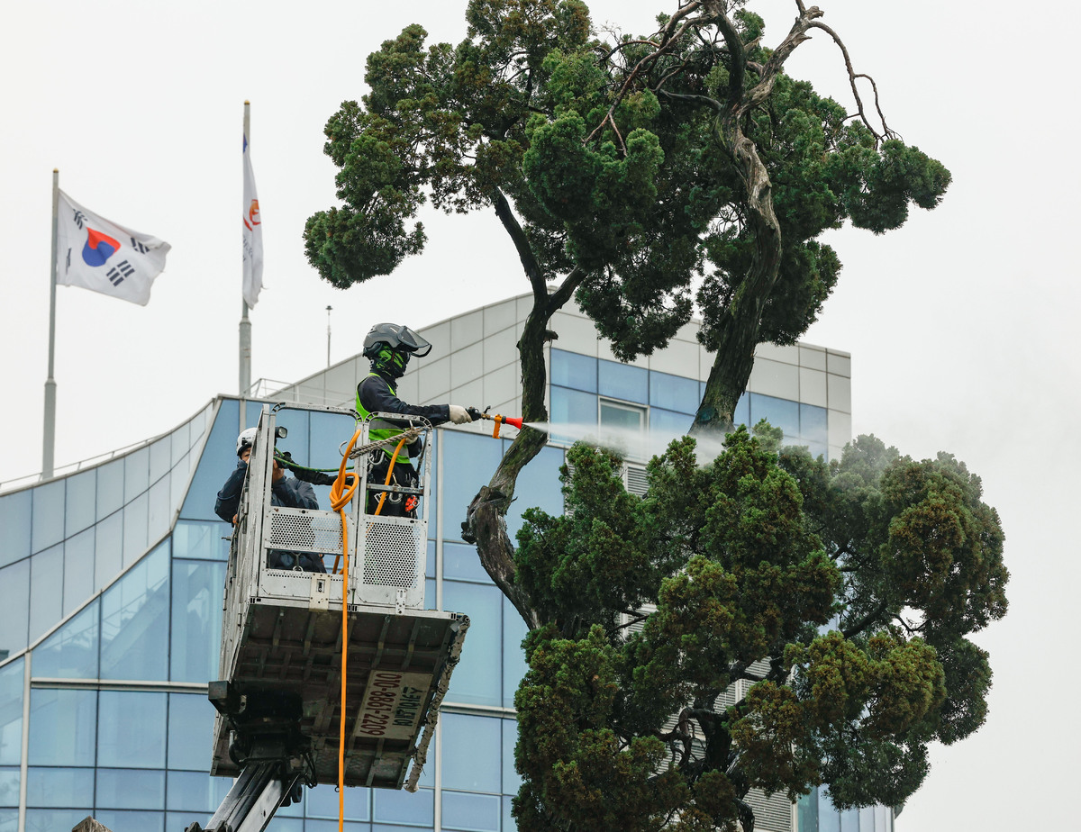 9일 서울 서초구 서초역 사거리에서 서초구청 관계자가 보호수 '천년향'을 세척하고 있다.