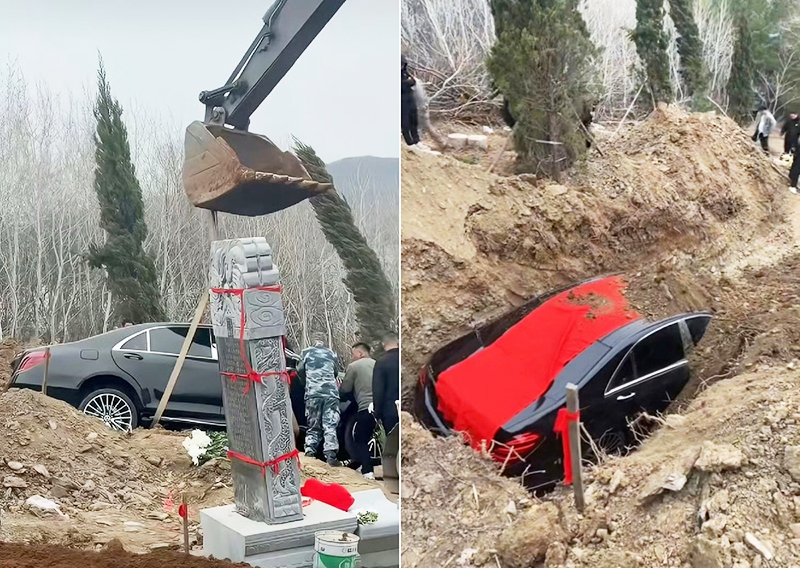 10일 중국 소셜미디어 웨이보 등에 따르면 전날 랴오닝 지역에서 촬영된 한 장례식 영상이 급속도로 확산하며 논란의 중심에 섰다. 영상 속에는 검은색 메르세데스-벤츠 S450L 한 대가 굴착기에 의해 거대한 묘지 구덩이 속으로 천천히 내려지는 충격적인 모습이 담겼다.