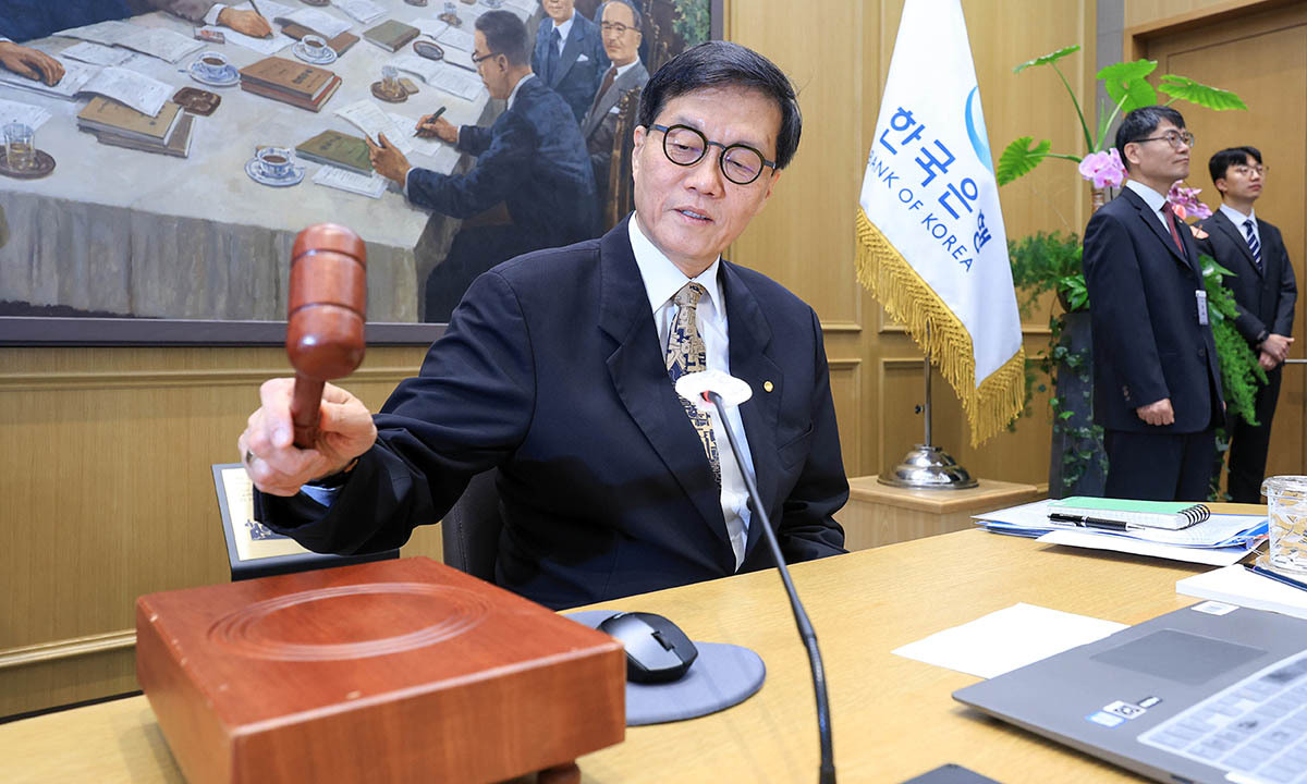 이창용 한국은행 총재가 10일 서울 중구 한국은행 본관에서 열린 금융통화위원회 본회의에서 의사봉을 두드리고 있다. 뉴스1