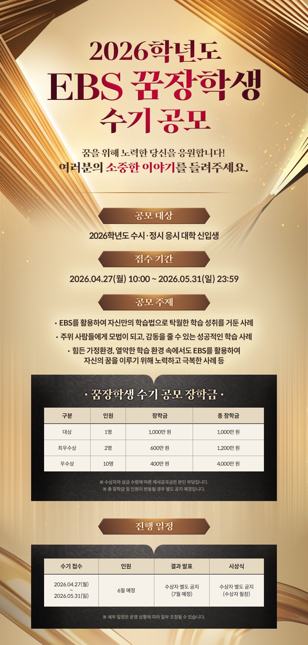 ‘2026학년도 EBS 꿈장학생’ 수기 공모는 27일부터 다음달 31일까지 EBSi 사이트(ebsi.co.kr)에서 접수할 수 있다.