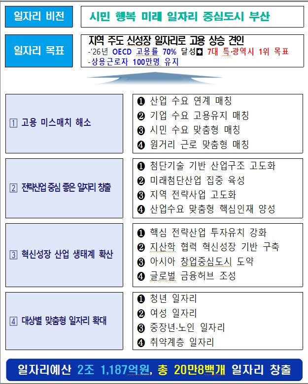 부산시가 2조1000억원을 투입해 경제협역개발기구(OECD) 기준(15~64세) 고용률 70% 달성을 목표로 일자리 20만개 창출에 나선다.
